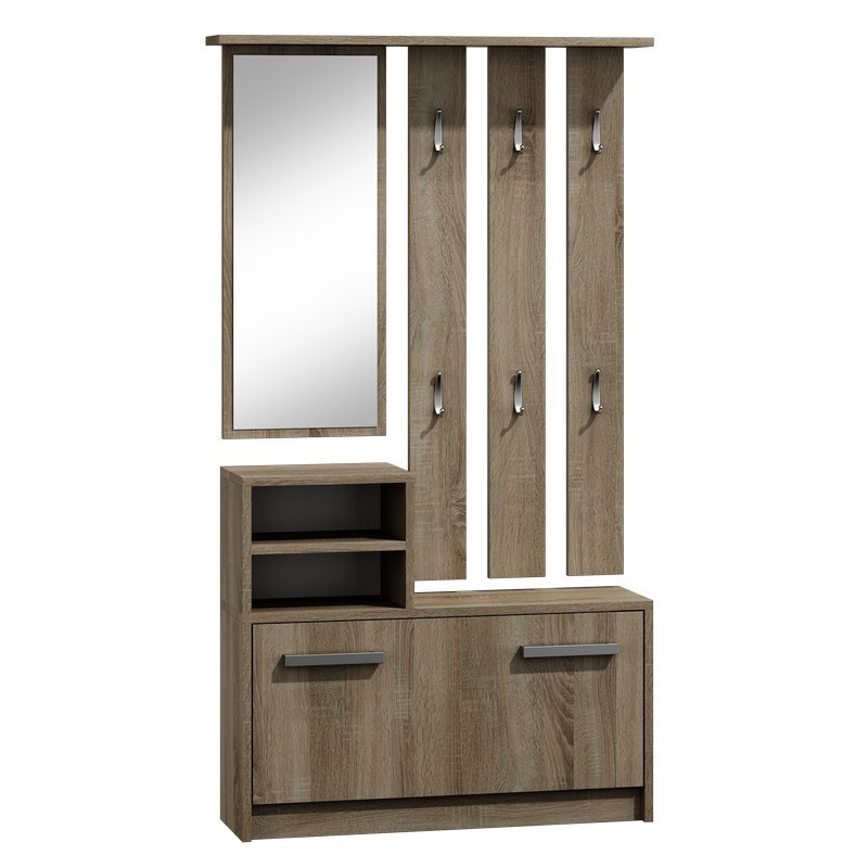 Az előszobafal magassága összesen kb. 155 cm, szélessége 85 cm, mélysége 24 cm. Dizájnjában és méreteiben is tökéletesen passzolhat az előszobádba.
